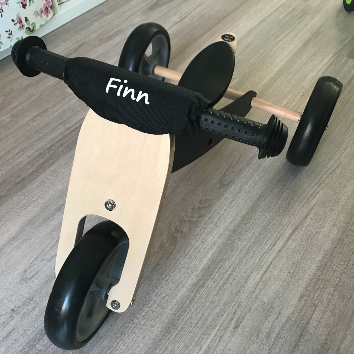 Het werd deze! De combinatie zwart met hout vind ik zo mooi! Stoer en strak. Het voordeel van deze houten loopfiets vind ik dat er vier “standen” zijn. Je kunt kiezen tussen een drie- en een tweewieler én die kun je weer in twee verschillende hoogtes zetten. Het grote voordeel vind ik dat hij er nu al prima op past met z’n één jaar en het dus ook een goed hulpmiddel bij het leren lopen van je baby kan zijn.
