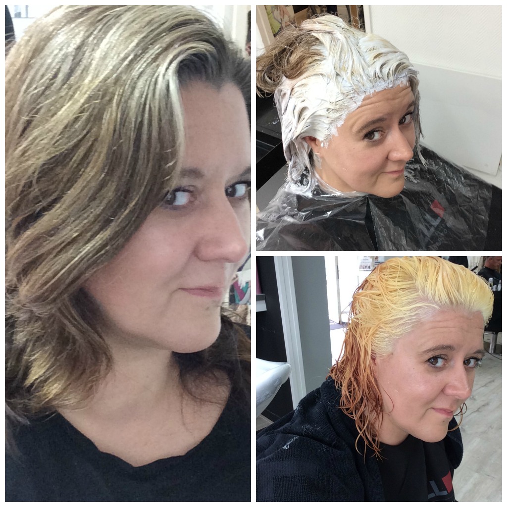Wat was het spannend, ben echt bang geweest dat het niet goed kwam. Hoeveel ik ook op Sandra en haar kunnen vertrouw. het was zo ontzettend, verschrikkelijk lelijk! Gelukkig was ze toen nog niet klaar… Het eindresultaat moet uiteindelijk, dankzij deze stappen, uitkomen op blond haar met mijn eigen haarkleur, inclusief grijs als uitgroei, dan zijn we klaar! Hierna nog één stap ga ik van uit.
