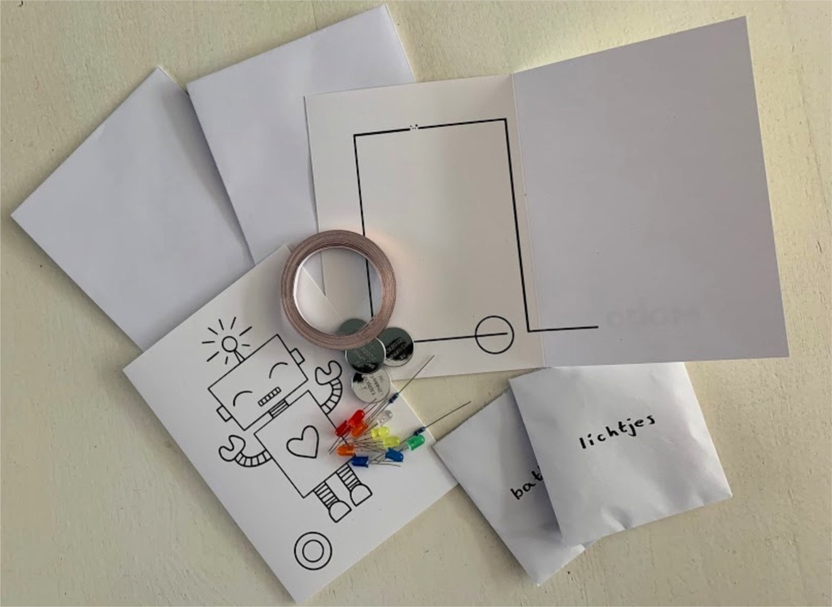 Deze uitdagende DIY box bevat; drie kaarten [twee met afbeelding, eentje blanco, voor volledige eigen creativiteit], twee enveloppen om de kaarten te versturen, kopertape, weerstandjes, lichtjes [LED] en batterijen plus een handleiding. Alles om met een stroomkring een werkende lichtgevende kaart te maken om te versturen!